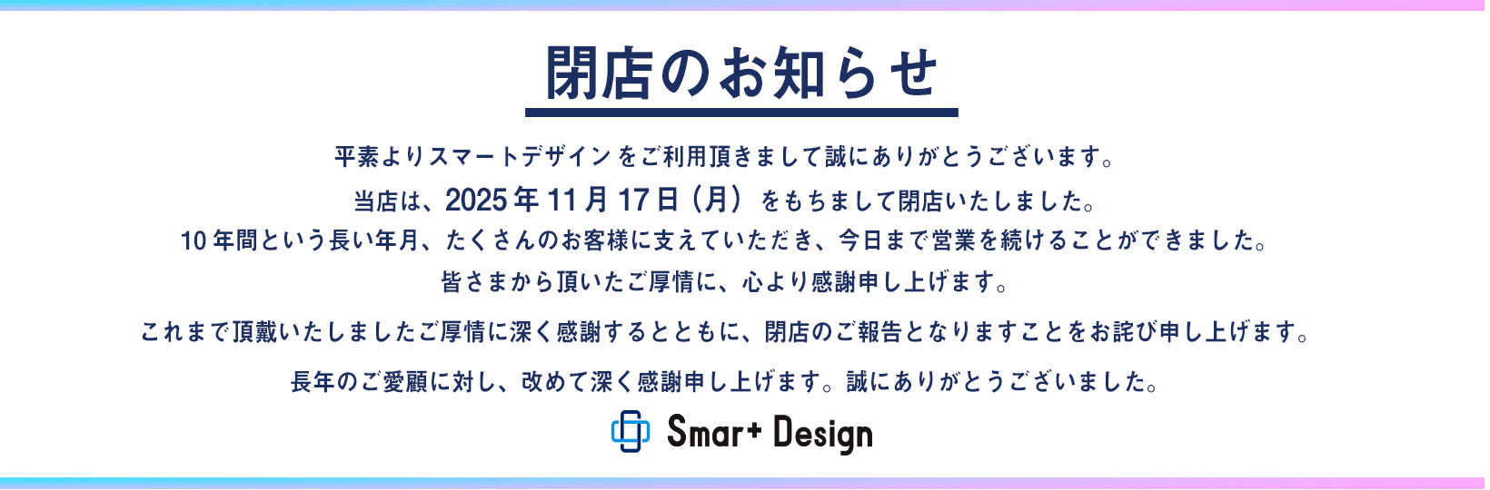 こんにちは! スマートデザインです😃 このたび当店は、2025年11月17日をもちまして閉店する...