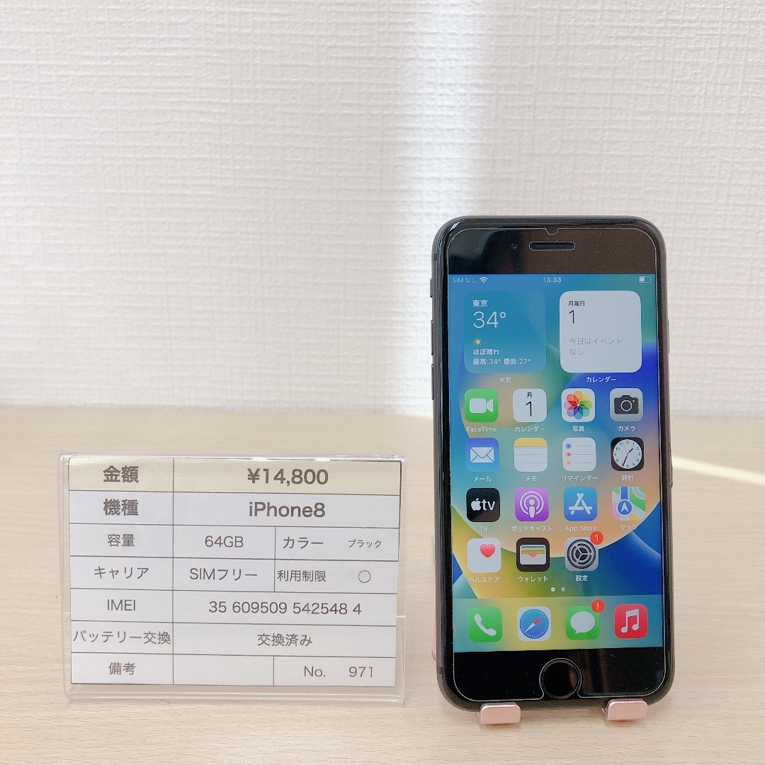 【SOLDOUT】【3ヵ月動作保証/バッテリー交換済】iPhone8 64GB SIMフリー 971